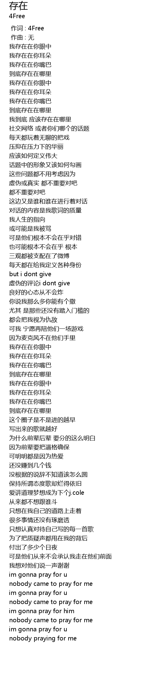 | [00:21.199] | wǒ cún zài zài nǐ zuǐ bā |
