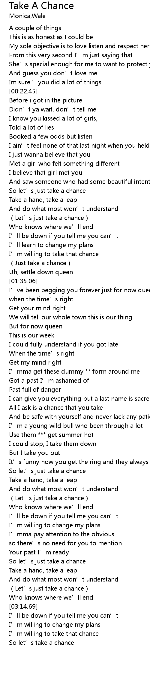 | [01:12.45] | Let' s just take a chance |