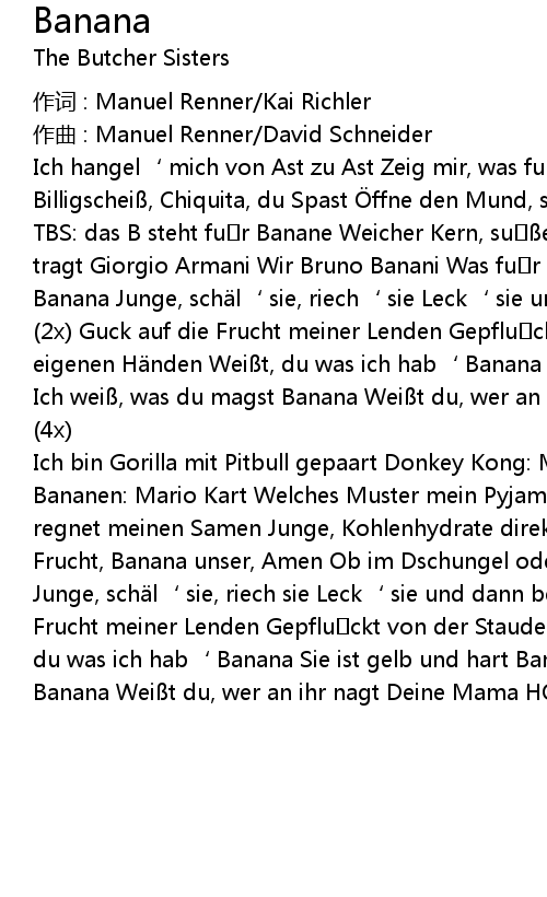 | Ich hangel' mich von Ast zu Ast Zeig mir, was fu r ne' Banane du hast Kein Billigschei, Chiquita, du Spast ffne den Mund, schluck' den Bananensaft TBS: das B steht fu r Banane Weicher Kern, su er Kern Und gelbe Schale Ihr tragt Giorgio Armani Wir Bruno Banani Was fu r Dolce Gabbana Wir wollen ' ne Banana Junge, sch l' sie, riech' sie Leck' sie und dann bei' sie ab 2x Guck auf die Frucht meiner Lenden Gepflu ckt von der Staude mit den eigenen H nden Wei t, du was ich hab' Banana Sie ist gelb und hart Banana Ich wei, was du magst Banana Wei t du, wer an ihr nagt Deine Mama Gorillamann 4x | |