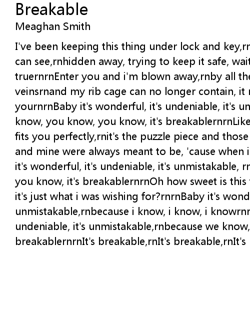 I've been keeping this thing under lock and key,rnin my rib cage where no one can see,rnhidden away, trying to keep it safe, waiting for someone pure and truernrnEnter you and i'm blown away,rnby all the music dancing through my veinsrnand my rib cage can no longer contain, it may be mine but it belongs to yournrnBaby it's wonderful, it's undeniable, it's unmistakable, rnbut so you know, you know, you know, it's breakablernrnLike it was tailored and made, it fits you perfectly,rnit's the puzzle piece and those spaces between,rnfingers and mine were always meant to be, 'cause when i give, i give for keepsrnrnBaby it's wonderful, it's undeniable, it's unmistakable, rnbut so you know, you know, you know, it's breakablernrnOh how sweet is this for me,rnhow did you know that it's just what i was wishing for?rnrnBaby it's wonderful, it's undeniable, it's unmistakable,rnbecause i know, i know, i knowrnrnBaby it's wonderful, it's undeniable, it's unmistakable,rnbecause we know, we know, we know, it's breakablernrnIt's breakable,rnIt's breakable,rnIt's breakable |