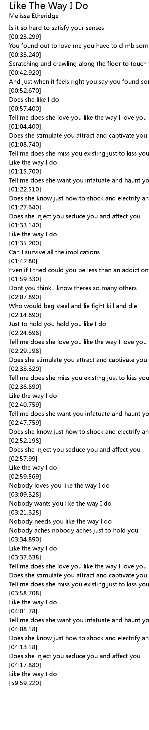 | [02:24.759] | Tell me does she love you like the way I love you |