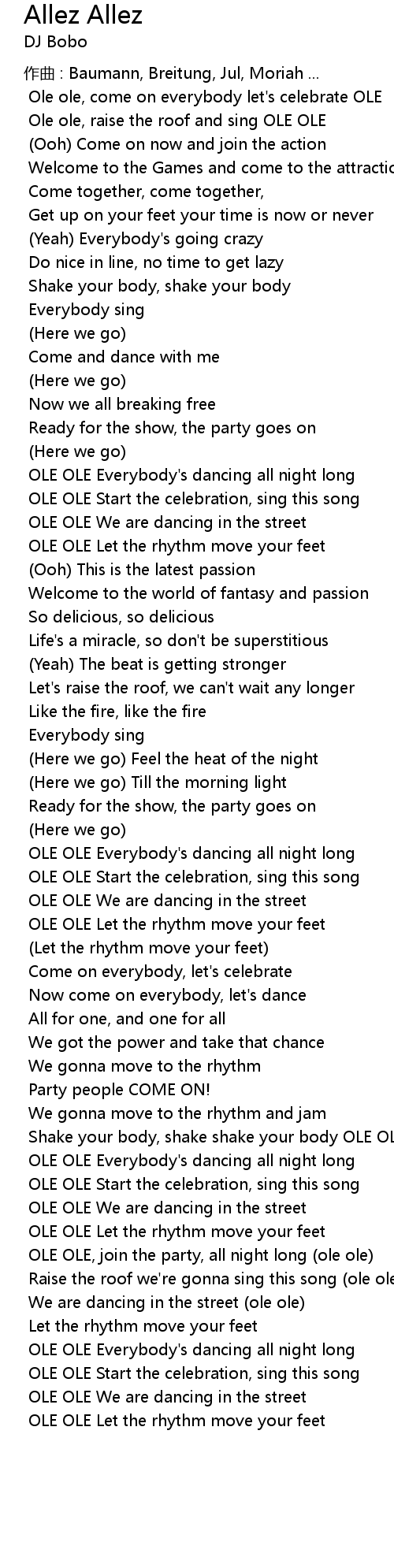 | OLE OLE Everybody' s dancing all night long | |
