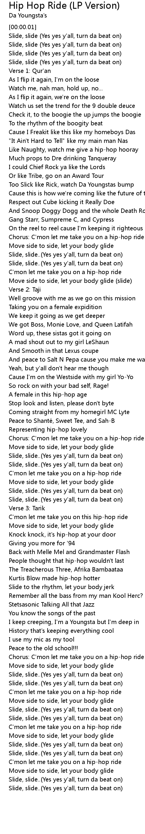 | [02:57.82] | Chorus: C' mon let me take you on a hiphop ride |
