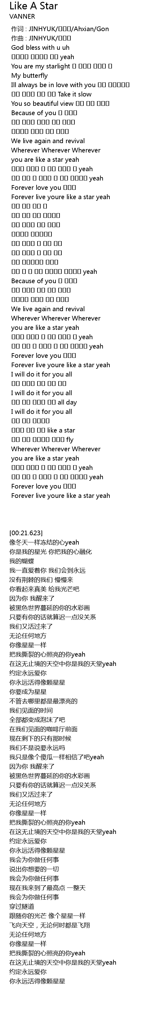 | [00:27.323] | You are my starlight 내 심장을 녹여준 너 |