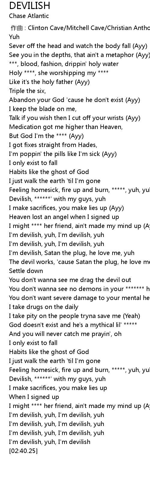 | [02:30.17] | I'm devilish, yuh, I'm devilish, yuh |