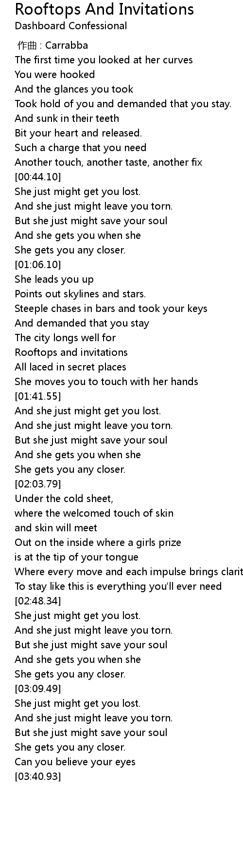 | [01:32.92] | Rooftops and invitations |