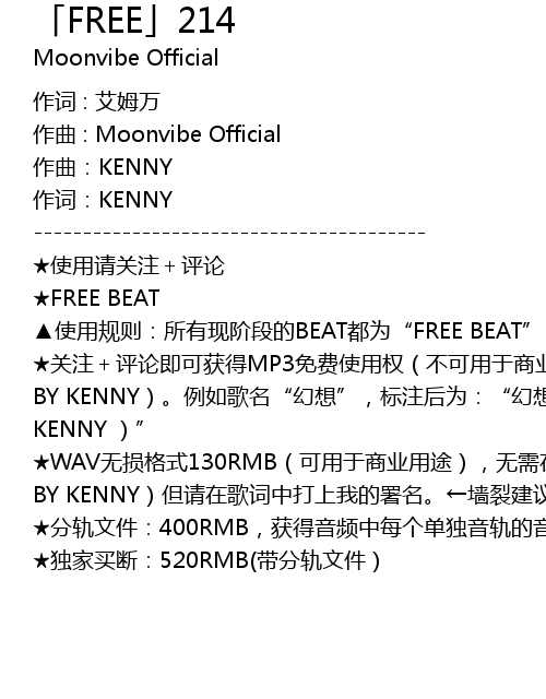 | ★WAV无损格式130RMB(可用于商业用途),无需在歌名后标注(PROD BY KENNY)但请在歌词中打上我的署名。←墙裂建议这种!!! | |