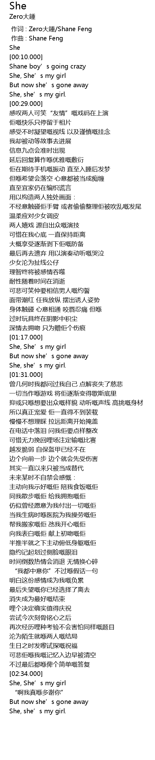 | [00:00.000] | zuo ci : Zero da zhong Shane Feng |