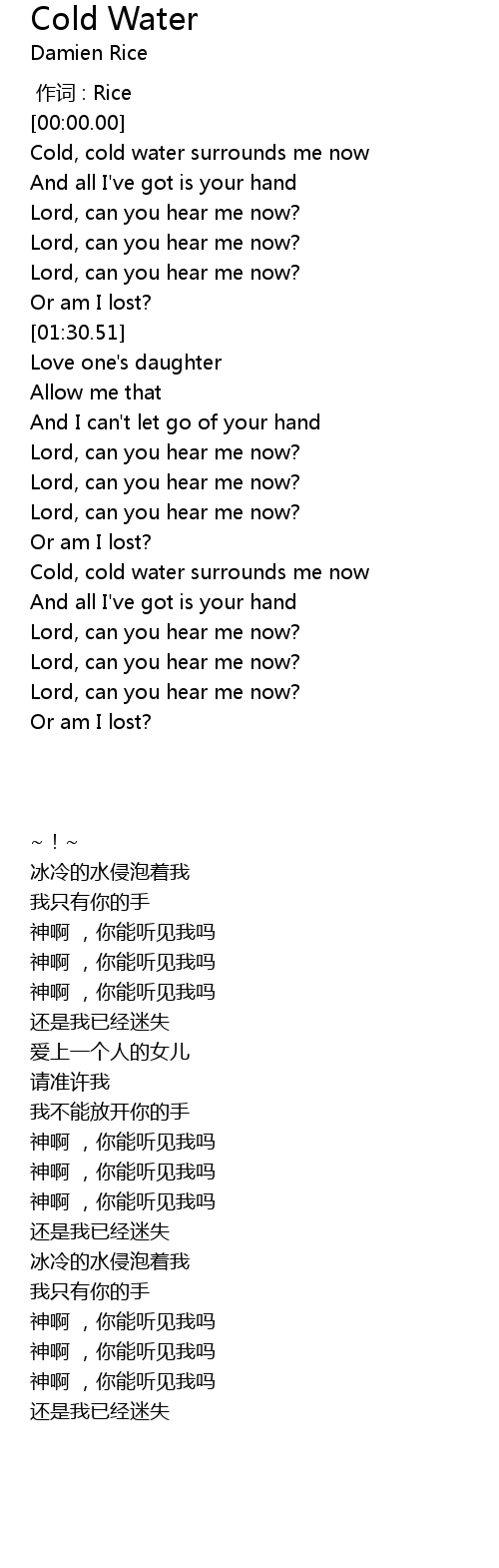 | [02:54.91] | Cold, cold water surrounds me now |