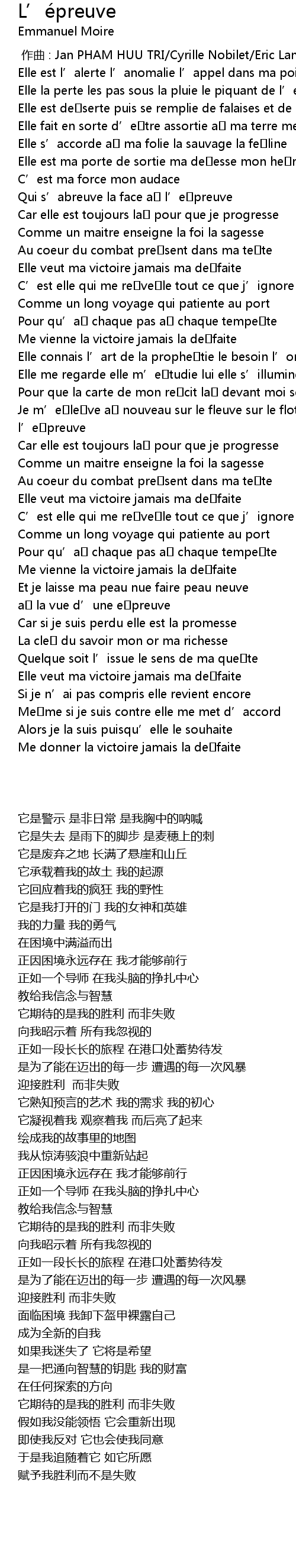 | [01:46.051] | Je m' e le ve a nouveau sur le fleuve sur le flot de l' e preuve |