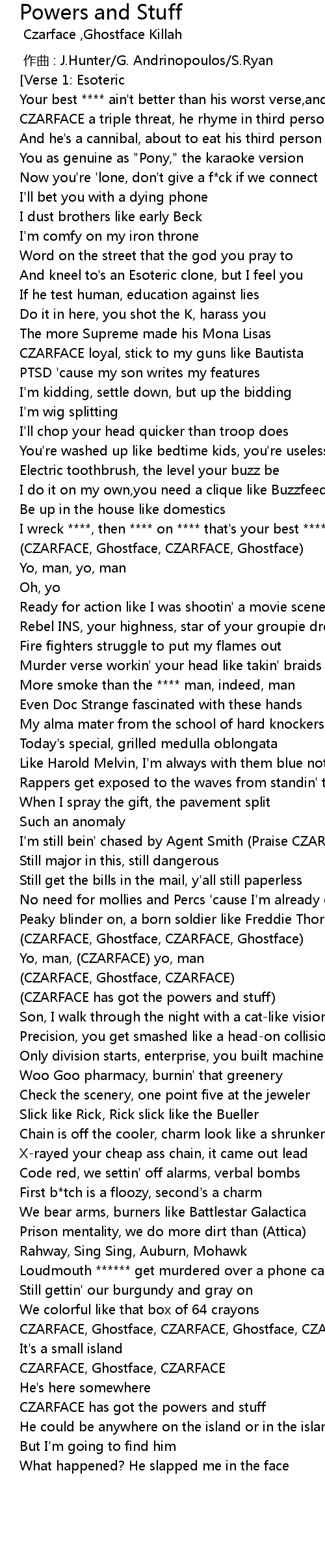 | [03:06.44] | CZARFACE, Ghostface, CZARFACE, Ghostface, CZARFACE |