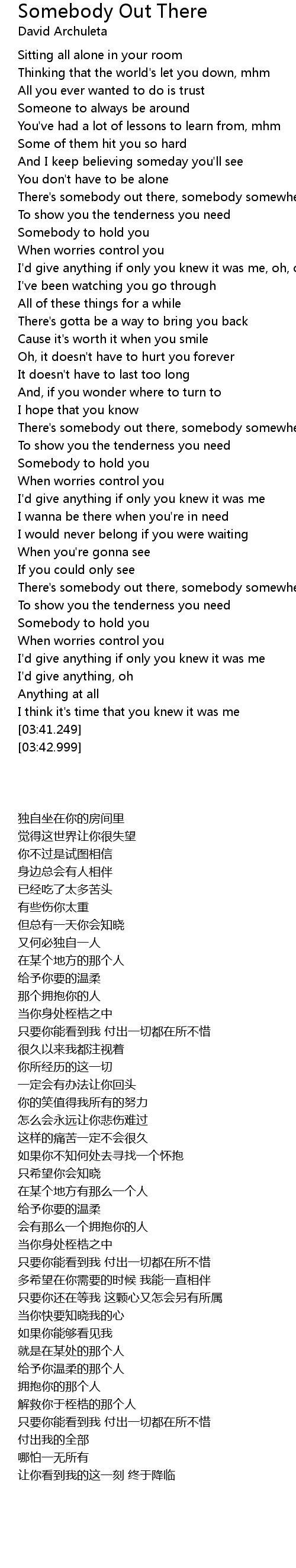 | [00:54.968] | There' s somebody out there, somebody somewhere |