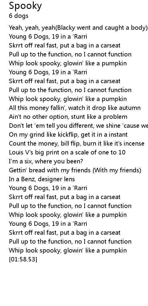 | [00:40.57] | Whip look spooky, glowin' like a pumpkin |