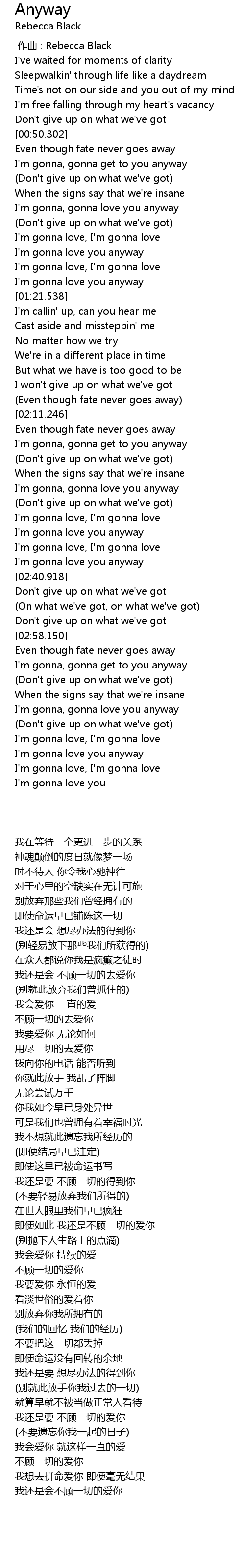 | [02:23.856] | I'm gonna, gonna love you anyway |