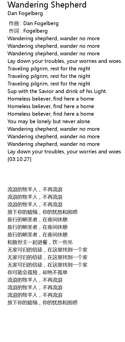 | [02:43.84] | Wandering shepherd, wander no more |
