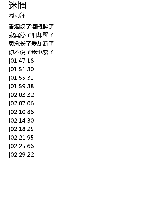 | [01:26.56][02:29.22][03:02.77][03:10.24][03:16.31][03:22.29] | 因为心早已迷惘了 |