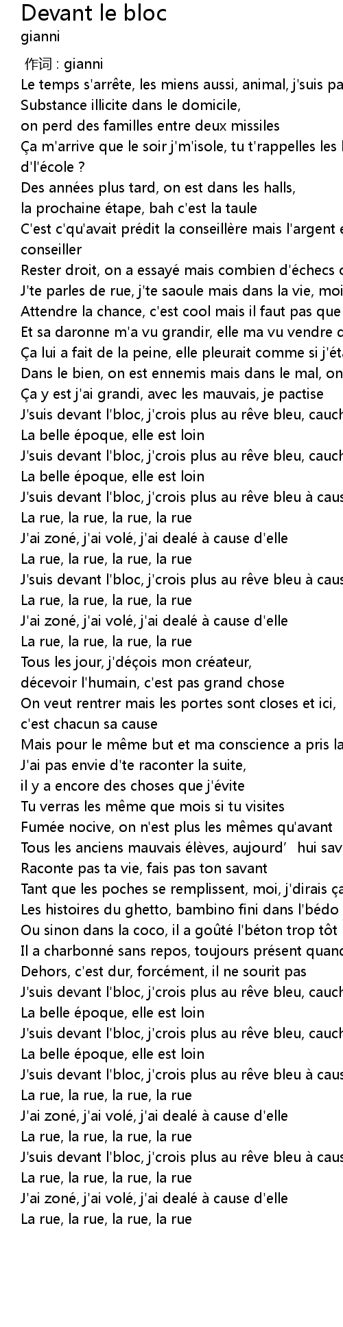 | [01:19.36] | J' suis devant l' bloc, j' crois plus au r ve bleu à cause d' elle |