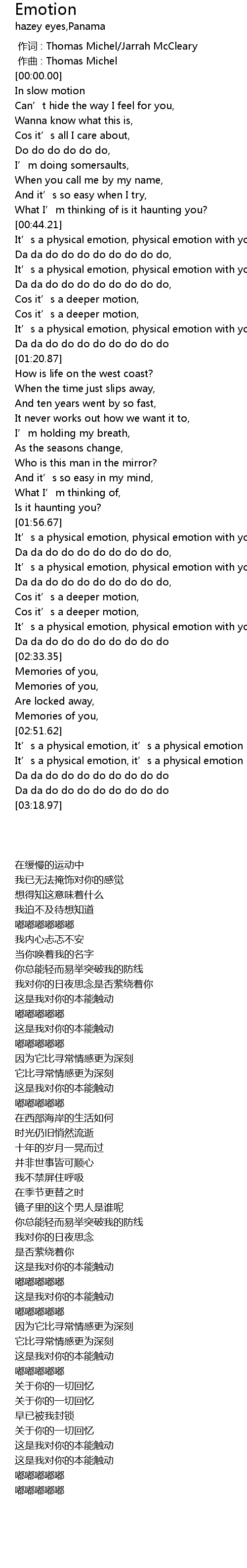 | [03:02.23] | It' s a physical emotion, it' s a physical emotion |