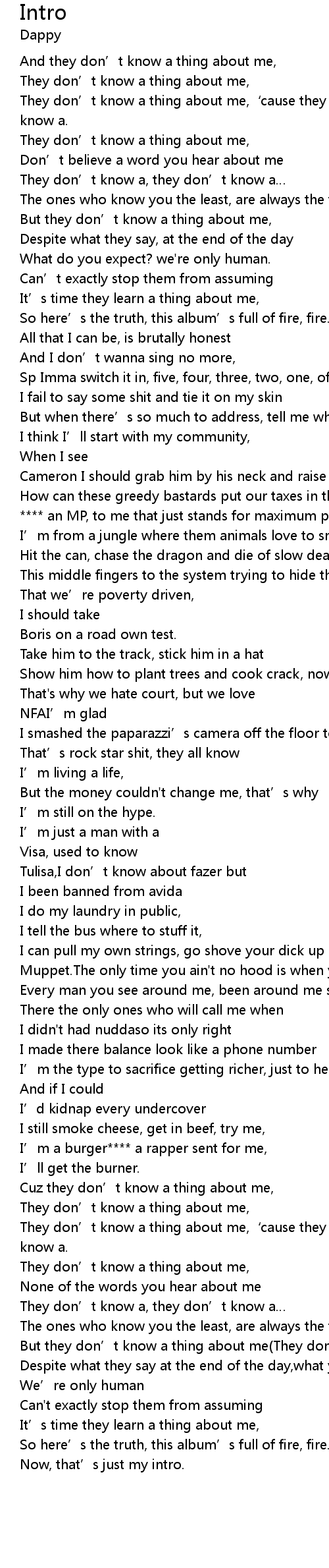 | They don' t know a thing about me,' cause they don' t know a, they don' t know a. | |