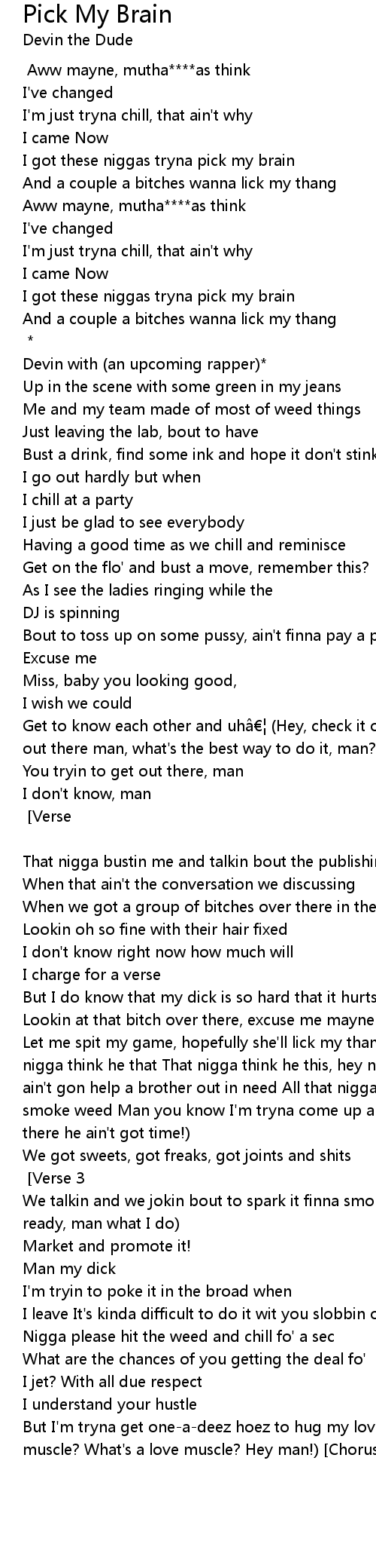 | Let me spit my game, hopefully she'll lick my thang (Oh that nigga trippin, that nigga think he that That nigga think he this, hey nigga ain't bout shit Man he ain't gon help a brother out in need All that nigga wanna do is **** hoes and smoke weed Man you know I'm tryna come up and tryna do mines And that nigga there he ain't got time!) | |