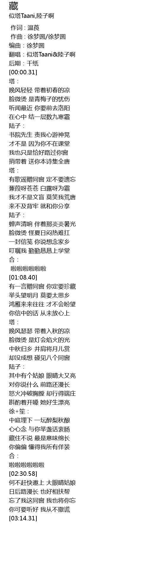 | [00:00.10] | 翻唱:似塔Taani&陸子啊 |