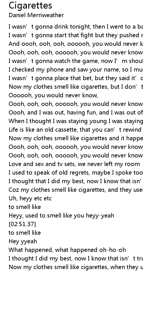 | [01:35.60] | Now my clothes smell like cigarettes and it happens all the time |