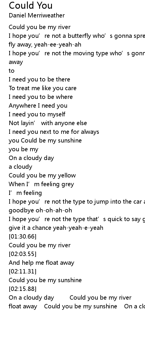 | [02:17.34] | On a cloudy day Could you be my river And help me float away Could you be my sunshine On a cloudy day |