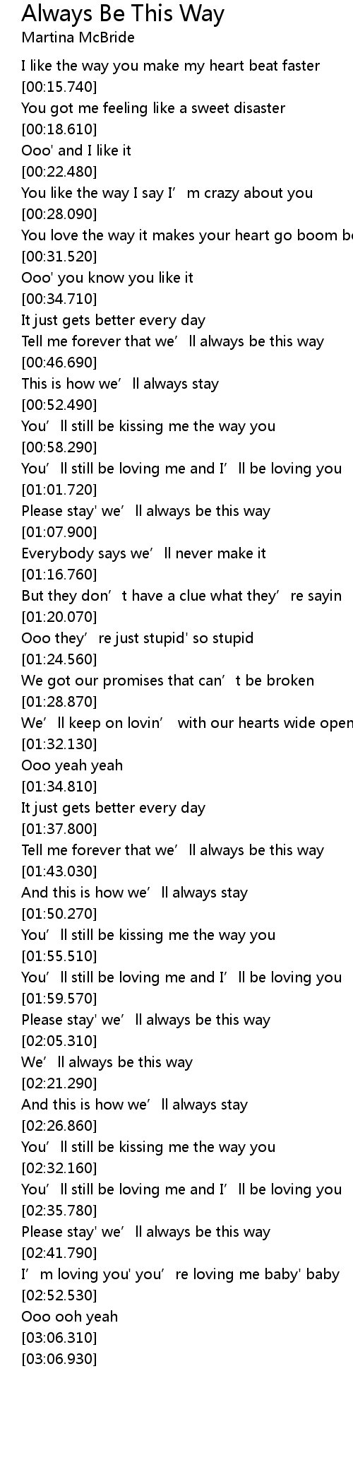 | [01:04.030] | Please stay' we’ll always be this way |