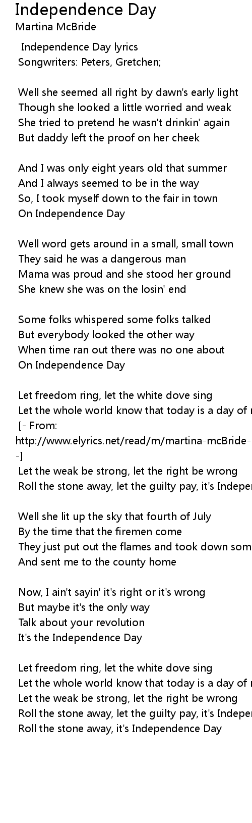 [- From: http://www.elyrics.net/read/m/martina-mcBride-lyrics/independence-day-lyrics.html -]