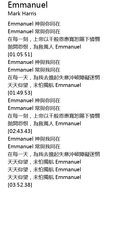| [02:00.65] | Emmanuel 神與你同在 |