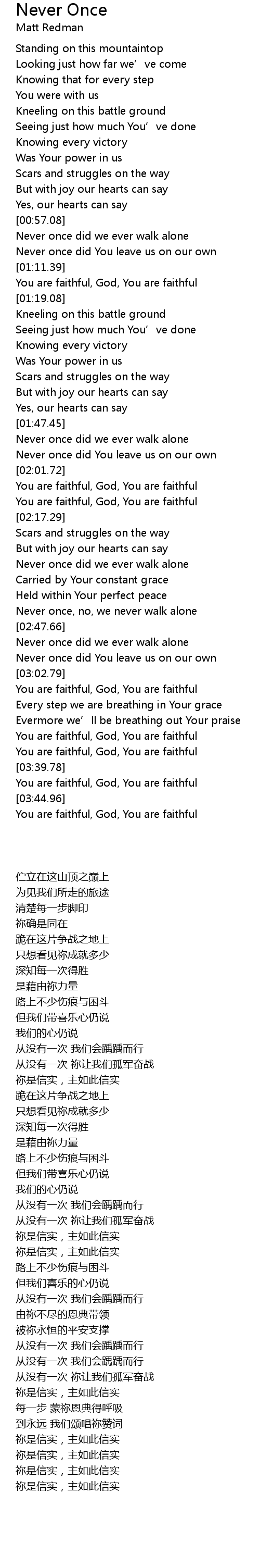 | [01:56.10] | 从没有一次 祢让我们孤军奋战 |