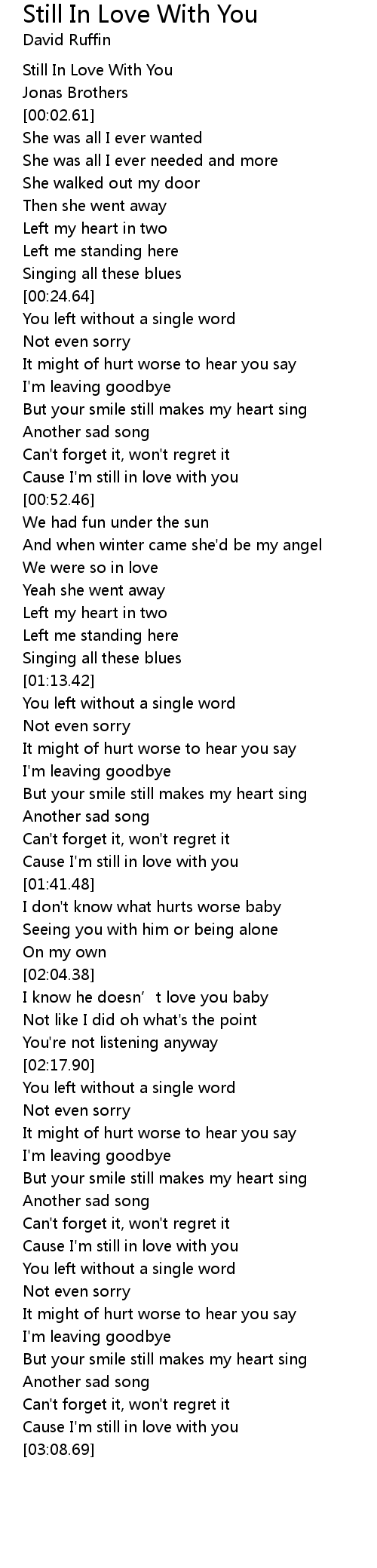 | [00:50.21] | Cause I' m still in love with you |