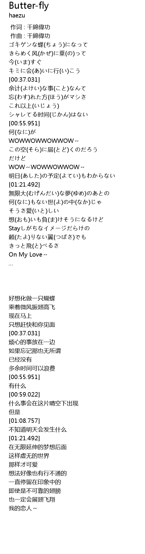 | [00:21.354] | ゴキゲンな蝶(ちょう)になって |
