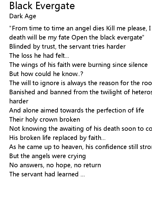| "From time to time an angel dies Kill me please, I love their cries A lonely death will be my fate Open the black evergate" | |