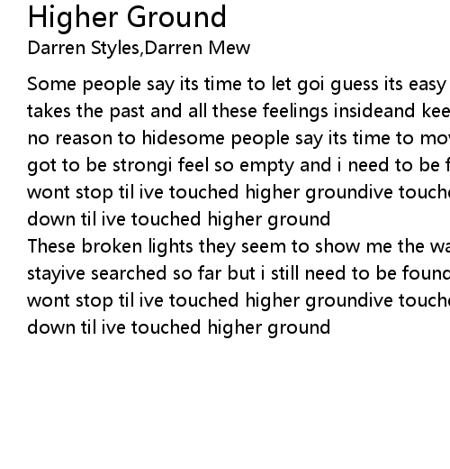 | Some people say its time to let goi guess its easy if its somewhere you knowthat takes the past and all these feelings insideand keeps them locked up so theres no reason to hidesome people say its time to move oni guess i need to but ive got to be strongi feel so empty and i need to be foundit sounds so crazy but i wont stop til ive touched higher groundive touched higher groundi'll never look down til ive touched higher ground | |
