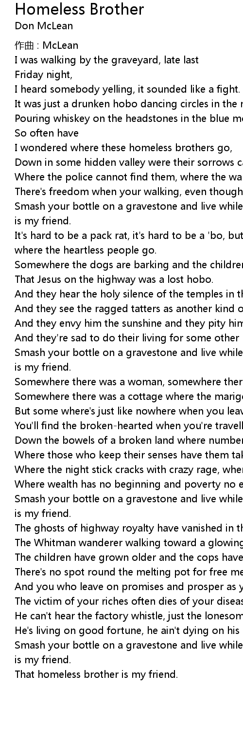 | Smash your bottle on a gravestone and live while you can, that homeless brother is my friend. | |