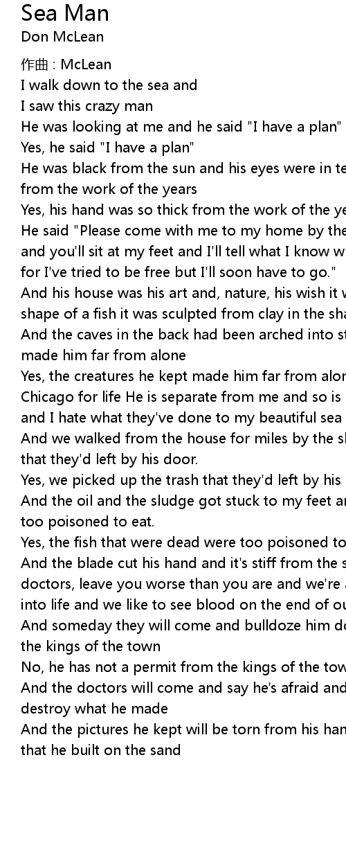 | He said "Please come with me to my home by the sea We can smoke, drink and eat and you'll sit at my feet and I'll tell what I know while the sea breezes blow for I've tried to be free but I'll soon have to go." | |