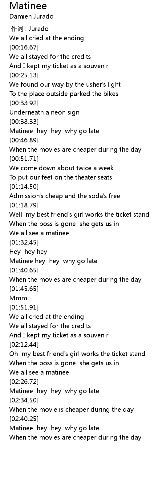 | [01:41.37] | When the movies are cheaper during the day |