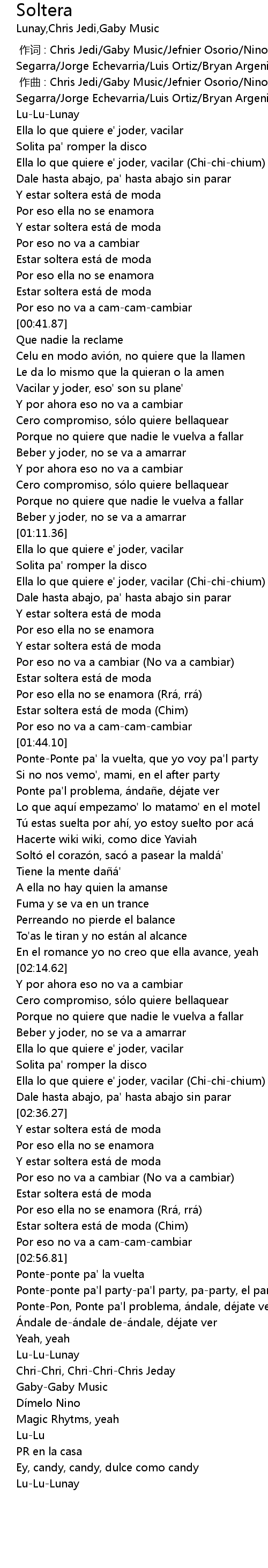| [00:14.44] | Ella lo que quiere e' joder, vacilar (Chi-chi-chium) |