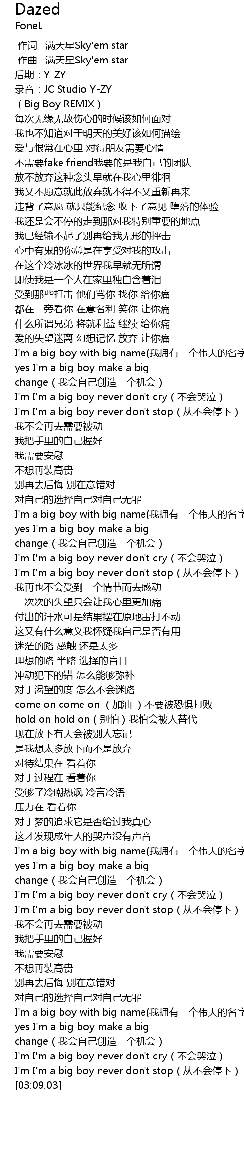 | [03:01.18] | I' m I' m a big boy never don' t cry bú huì kū qì |