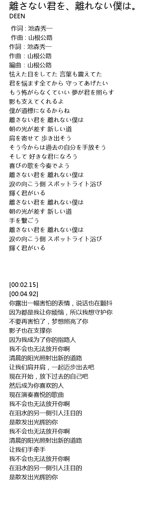 | [04:22.22] | 涙の向こう側 スポットライト浴び |