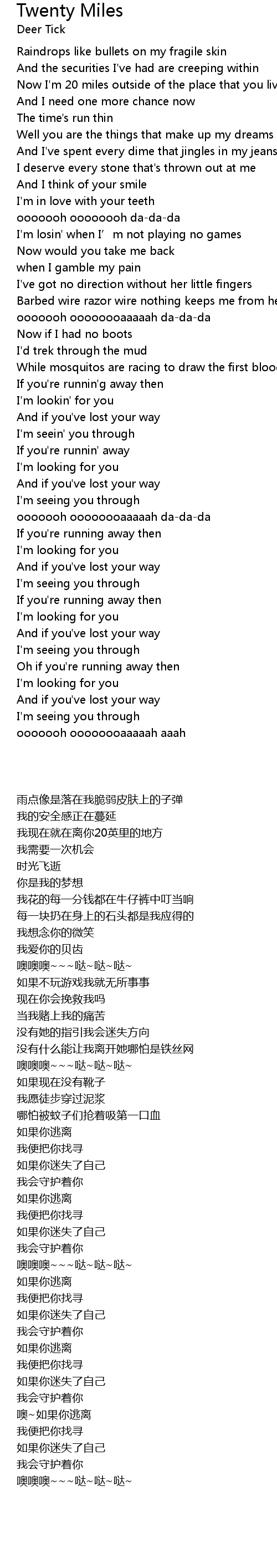 | [00:29.05] | 我现在就在离你20英里的地方 |