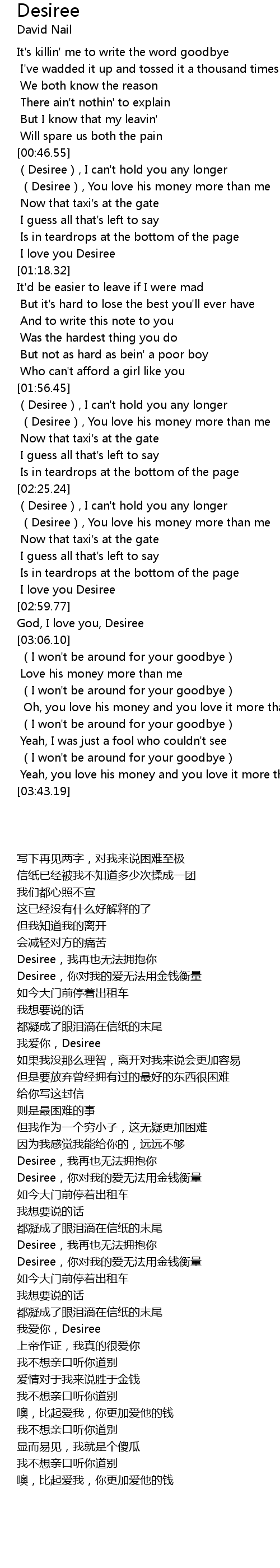 | [00:46.99] | Desiree, I can' t hold you any longer |