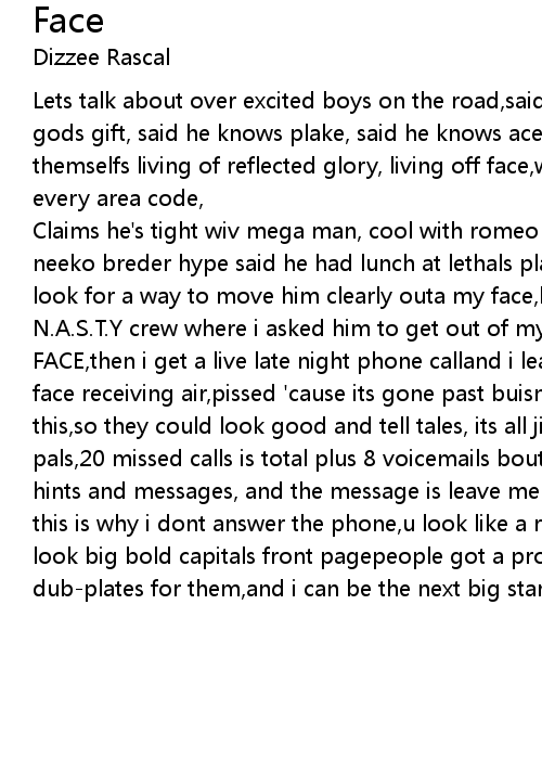 FACE,then i get a live late night phone calland i leave him there, hopes for the face receiving air,pissed 'cause its gone past buisness hours on the clock this,so they could look good and tell tales, its all jiggy and we look like pals,20 missed calls is total plus 8 voicemails bout 14 messagespeople cant take hints and messages, and the message is leave me alone.number dont look local this is why i dont answer the phone,u look like a real top boi when the gurls look big bold capitals front pagepeople got a problem, act like i used to make dub-plates for them,and i can be the next big star in your phone book, |