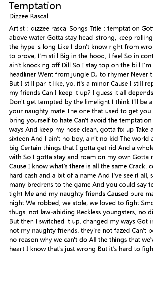 | [00:03.52] | Artist: dizzee rascal Songs Title: temptation Gotta keep my head above water Gotta stay headstrong, keep rolling on No point getting caught in the hype is long Like I don' t know right from wrong So I gotta be real Nothing to prove, I' m still Big in the hood, I feel So in control, I' m chill No one ain' t knocking off Dill So I stay top on the bill I' m the main event, the headliner Went from jungle DJ to rhymer Never thought I would be the big timer But I still par it like, yo, it' s a minor Cause I still rep my ends, still check my friends Can I keep it up? I guess it all depends If I can keep my mind right Don' t get tempted by the limelight I think I' ll be alright Temptation leads like your naughty mate The one that used to get you in bother The one you can never bring yourself to hate Can' t avoid the temptation But I know I gotta change my ways And keep my nose clean, gotta fix up Take a look at my life cause I ain' t sixteen And I ain' t no boy, ain' t no kid The world ain' t flat and the picture' s big Certain things that I gotta get rid And a whole lot more that I gotta get with So I gotta stay and roam on my own Gotta move on, I can' t stay at home Cause I know what' s there is all the same Crack, cocaine and ghetto fame Cold hard cash and a bit of a name And I' ve see it all, so I need a change Lost too many bredrens to the game And you could say temptation' s to blame We used to be tight Me and my naughty friends Caused pure madness in the ends I mean day and night We robbed, we stole, we loved to fight Smoking, drinking, joyriding Drugs, thugs, not lawabiding Reckless youngsters, no direction No sign of correction But then I switched it up, changed my ways Got in the area like, Oh my days But not my naughty friends, they' re not fazed Can' t believe that this music pays See no reason why we can' t do All the things that we' ve always done Still in my heart I know that' s just wrong But it' s hard to fight the temptation, son |