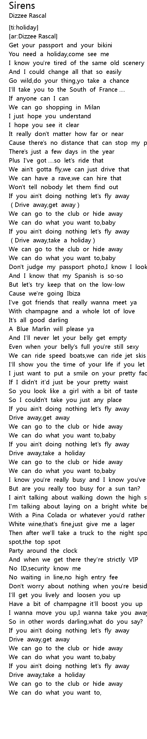 | [00:13.70] | You need a holiday, come see me |