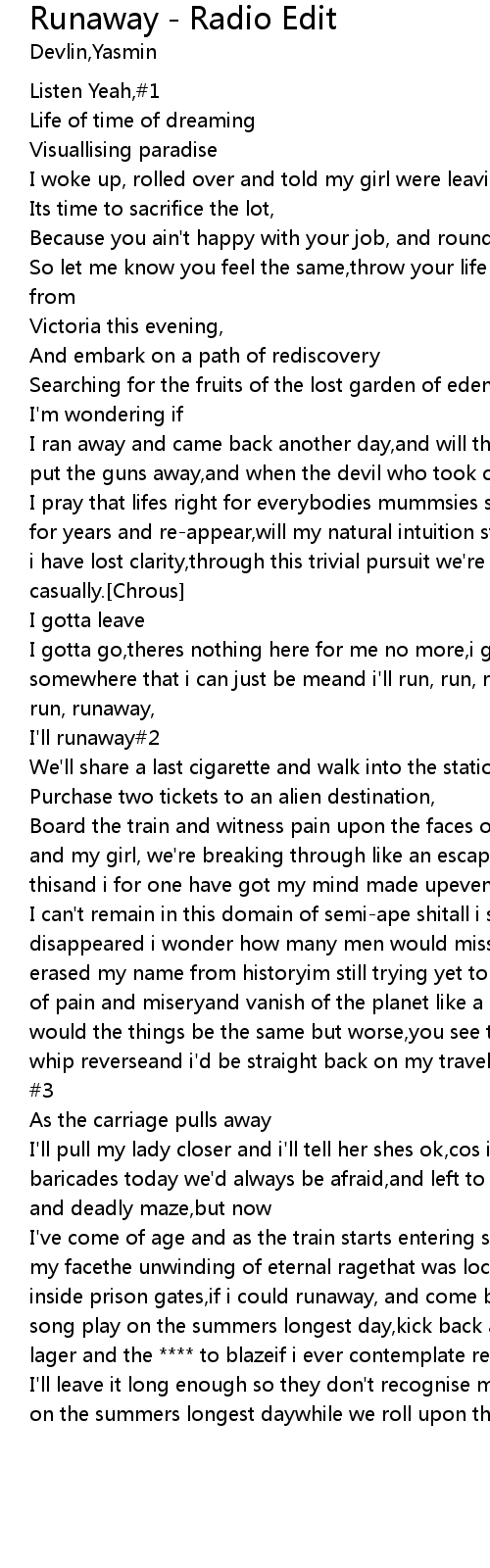 | I gotta go,theres nothing here for me no more,i gotta be freei gotta be somewhere that i can just be meand i'll run, run, runawayrun, run, runaway,run, run, runaway, | |