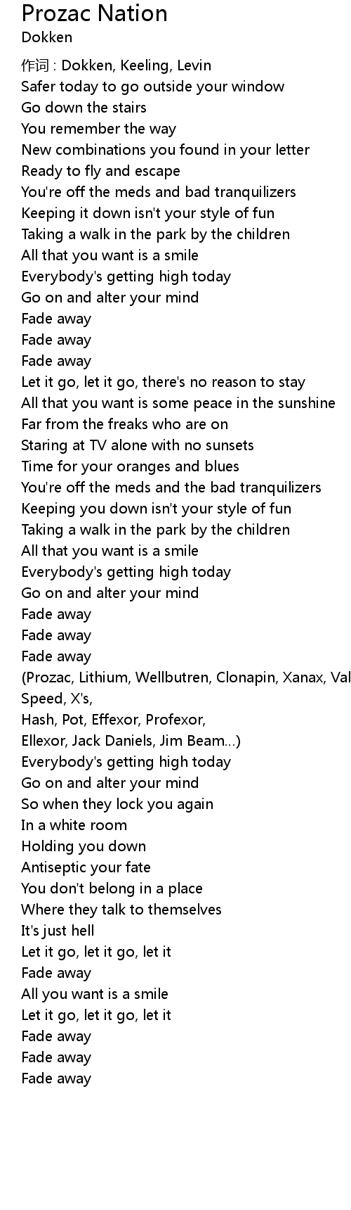 | Prozac, Lithium, Wellbutren, Clonapin, Xanax, Valium, Crack Cocaine, Heroine, Speed, X' s, | |