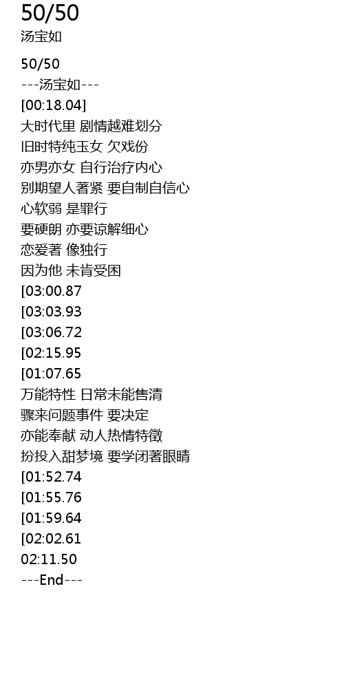 | [03:16.43][03:00.87][02:19.80][02:06.05][00:54.09] | zhe 50 50 yi ban shen fen nv ren |