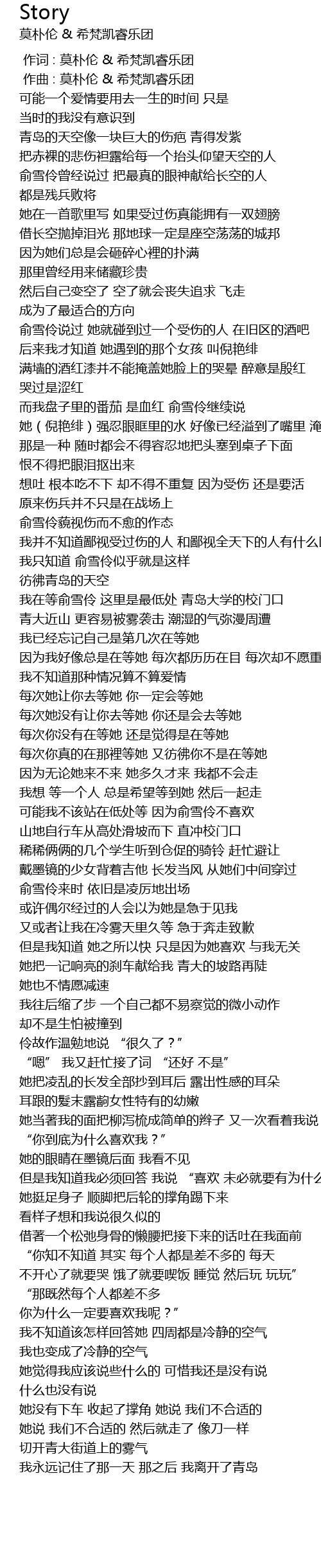 | [00:37.41] | 青岛的天空像一块巨大的伤疤 青得发紫 把赤裸的悲伤袒露给每一个抬头仰望天空的人 |